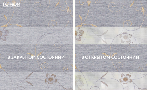 Полотно ткани, состоит из чередующихся горизонтальных полос – прозрачных и непрозрачных. Изменяя положение этих полос относительно друг другу, можно создать целых 3 режима регулировки светом. Например, чтобы в помещении стало светлее, нужно расположить прозрачные полосы друг напротив друга. Если разместить прозрачную и непрозрачную полосу параллельно друг другу, то можно добиться практически полного затемнения.